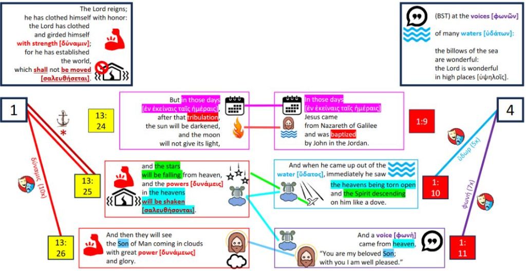 The Lord girding Himself with strength and establishing the world so it not be moved (verse 1) is laid alongside the voices of many waters (verse 4). Since the diagram above is a bit of a fire-hose of information to take in all at once, we’ll walk through it piece by piece. The first piece, the first row, is Mark 13:24 and 1:9: