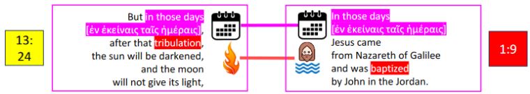 Neither has any hyperlink to Psalm 93. Their relevance stems from their organic connections to their respective succeeding verses that do hyperlink to Psalm 93. Mark’s identically worded “in those days” forms a literary link between them (occurring also in Mark 8:1 and 13:17 but in no other Gospel). What’s interesting is that the context of Mark 13 is the Second Coming of Christ. “After that tribulation” in 13:24 refers back to what Jesus was saying about wars and rumors of wars (verse 7), earthquakes and famines (verse 8), and His followers being hated by all (verse 13), just to cite a few.