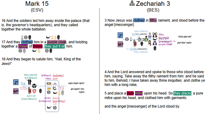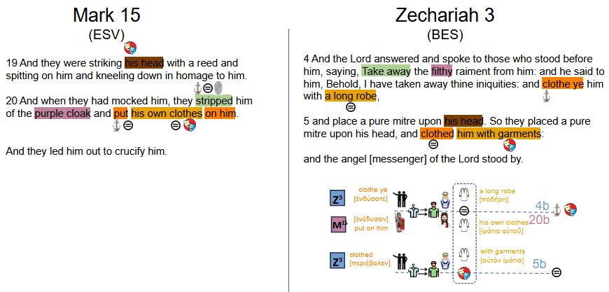 See “purple cloak” highlighted in Mk 15:17? The light purple highlight there matches up with “filthy” in Zec 3:3. It’s got that funny “W” icon for wordplay. (I have a legend for all these icons at the end). This means Mark used a play on words (a pun) to create a literary link here. The diagram under Zec 3:3 shows the Greek wordplays with the pronunciations: por-foo’-ran (purple cloak) with rhoo-par-ah’ (filthy). Usually five or more letters match between the two words to be an obvious wordplay. Although this is commonplace among the Bible authors, the average Christian probably isn’t so well acquainted with them (I know I wasn’t until the last year or two). What this does is link the purple cloak to the filthy clothes worn by the high priest Joshua (“Jesus” per the Brenton English Septuagint [BES] translation because in Greek it’s the same name). Here’s a big clue to our Zechariah parable: Joshua wearing the filthy clothes links to Jesus wearing the purple cloak!