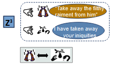 “Crown” here shows an icon with an “=” inside a circle, a synonym. The mitre displays the “holy crown” (Ex 29:6). The high priest’s mitre is synonymous with a crown. Word links “clothed” and “they put it on” are likewise synonyms. These two scenes coalesce by two rare word links (golden anchors) and synonyms that mirror the actions of Zechariah’s vision with the actions of the Roman soldiers and Jesus. Zechariah actually provides a bit of explanation as to the meaning of the filthy garments: