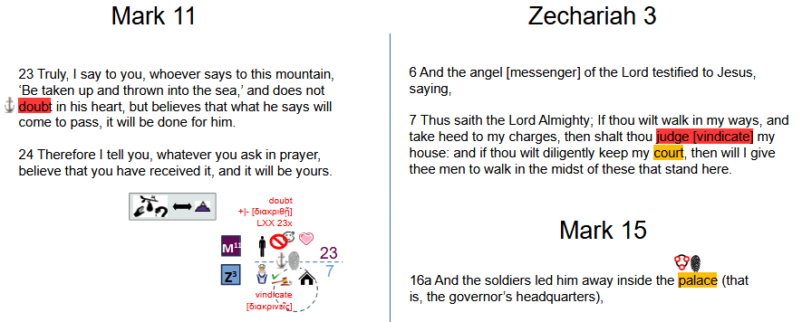 The silver anchor of red highlighted “doubt” indicates that word Mark uses only one time and there are multiple instances of it in the Septuagint. I must confess that “doubt” and “judge [vindicate]” has been challenging to get my head around. But in meditating on the Mark 11 context, removing a mountain (which happens, by the way, not coincidentally in Zec 4) is an alternate way of thinking about removing our sins (mountainous!) as depicted in the filthy garment removed from Joshua the high priest. That’s why I have “[vindicate]” rather than “judge” as it fits with God’s house—His people—being vindicated from their sins (i.e., mountain moved, filthy garments removed). The Hebrew word here can mean judge or vindicate; the context of the passage determines which one. For instance, in Genesis 30:6 Rachel said, “God has judged me,” by blessing her with a son, Dan. Her context means that God vindicated her, not judged her in a condemnatory way.