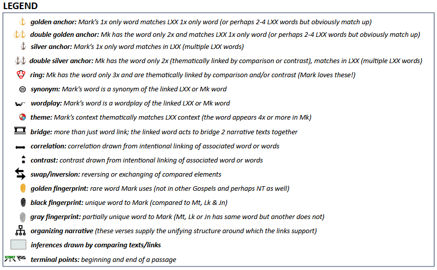 The icons to the right of the “W” icon are icons that convey intentionality. Did Mark really intend to link these? These icons identify rarity that suggest purposeful selection. The double gold anchor means Mark used this word only twice (the other comes in verse 20) and matches to the word that appears only once or twice in the Septuagint (here it’s twice: Zec 3:3 and 4).
