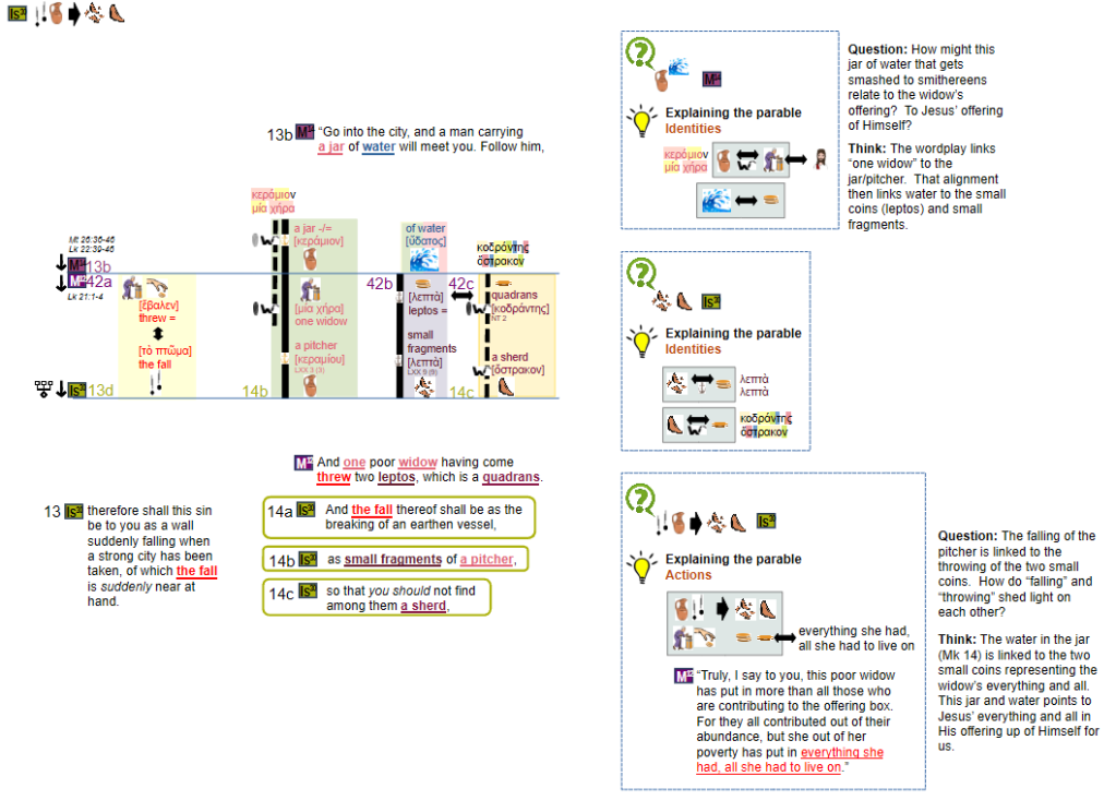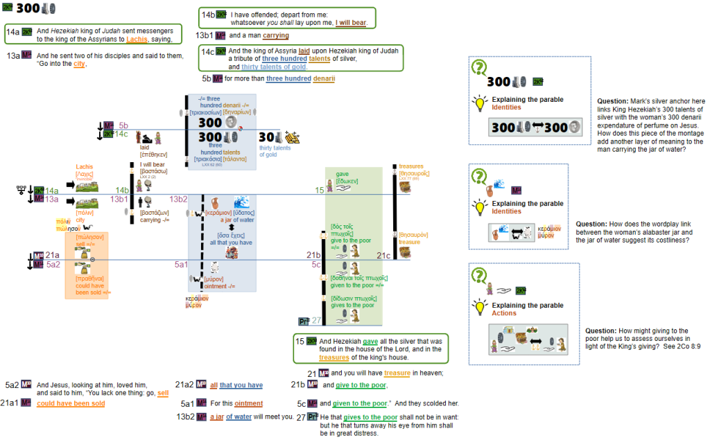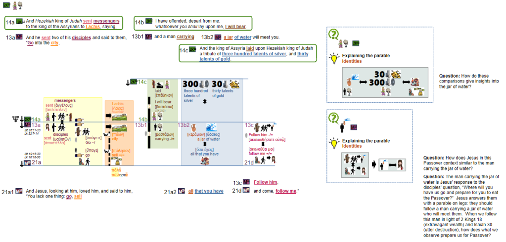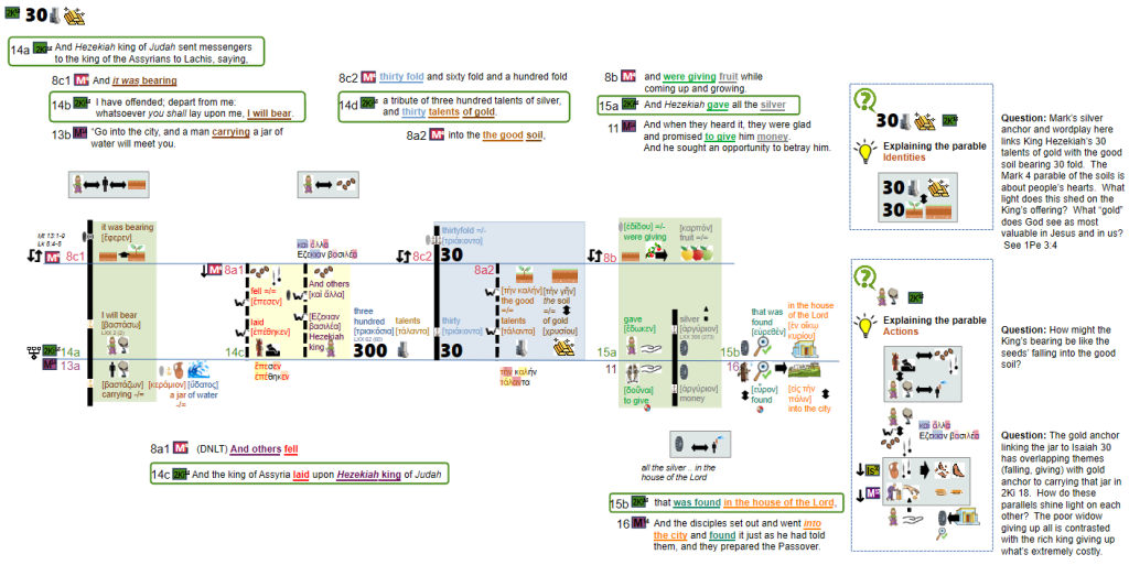 What’s new here is the addition of the parable of the soils in Mark 4. The “thirty” of the thirty talents of gold has a silver anchor link to the “thirty” fold fruitfulness of the seeds sown into the good soil. The bearing of the good soil (leftmost light green rectangle) is a synonym of bearing and carrying. Mark does an extremely clever wordplay with “And others” and “Hezekiah king” (light yellow rectangle). Matthew’s and Luke’s versions of this parable do not leverage the phrase “and others” for this wordplay. There’s a second wordplay with “the good” and “talents” (light blue rectangle). The giving of fruit also matches thematically with Hezekiah’s giving the silver and gold and the chief priests’ giving money to Judas Iscariot to betray Jesus (rightmost light green rectangle). Now, please check out the questions in the diagram for more insights.