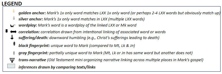 Our final peek into the costliness of this Passover offering is the 30 talents of gold. Take a look at this diagram that shows Mark’s hyperlinking in this context (see the light blue rectangle for the silver anchor links with “30”):