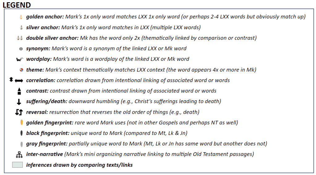 I love studying God’s word to know His heart and mind.  So I love Bible commentators, whether books or Bible study apps or sermons.  Above all this, by far and away the best Bible commentator I’ve ever come across is Mark, the Gospel author.  Better than the prince of preachers, Charles Spurgeon.  Matthew Henry.  Jameson, Fausset & Brown.  Better than J. Vernon McGee and David Guzik.  Better than the Bible Hub app’s consolidation of commentators.  Now, Mark’s way of providing biblical commentary is much different than our modern ways.  Mark mimics the ancient literary practices of the Hebrews who authored and assembled the Old Testament.  How Mark provides scriptural insights is by crafting the Greek words of his text to sync up to the Greek translation of the Old Testament of his day, the Septuagint.  By using a variety of literary techniques (e.g., rare word match ups, symmetry, word plays, etc.), we can plunge into the depths of those Hebrew Scriptures to discover so many fascinating and surprising links that unveil our Lord Jesus Christ!