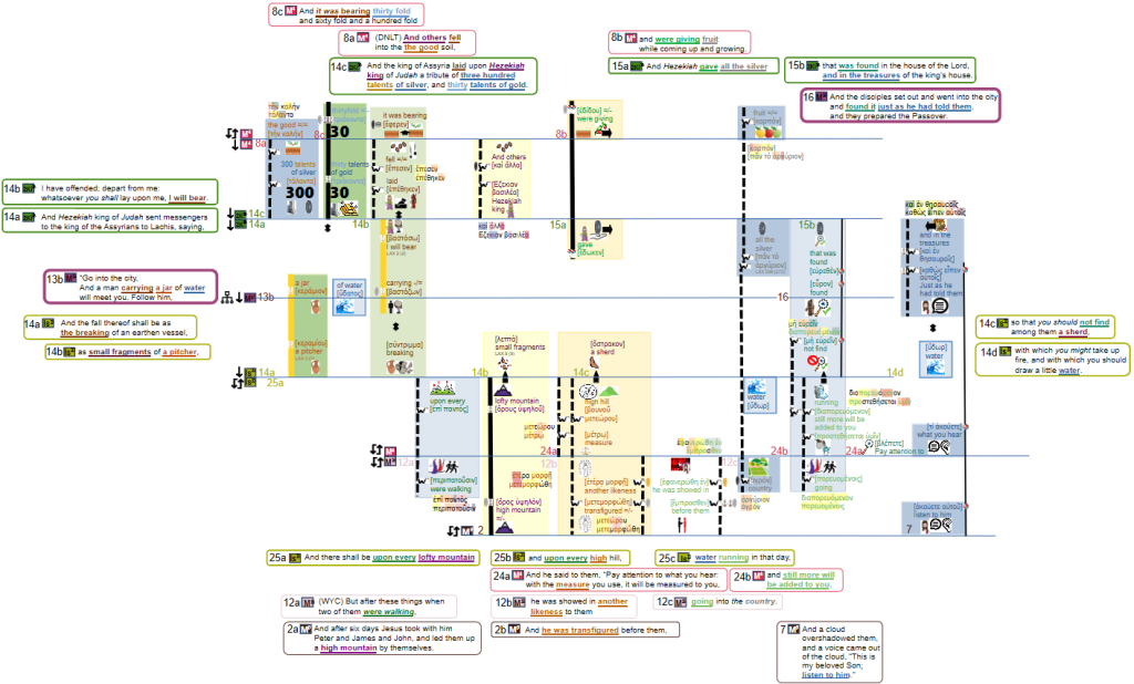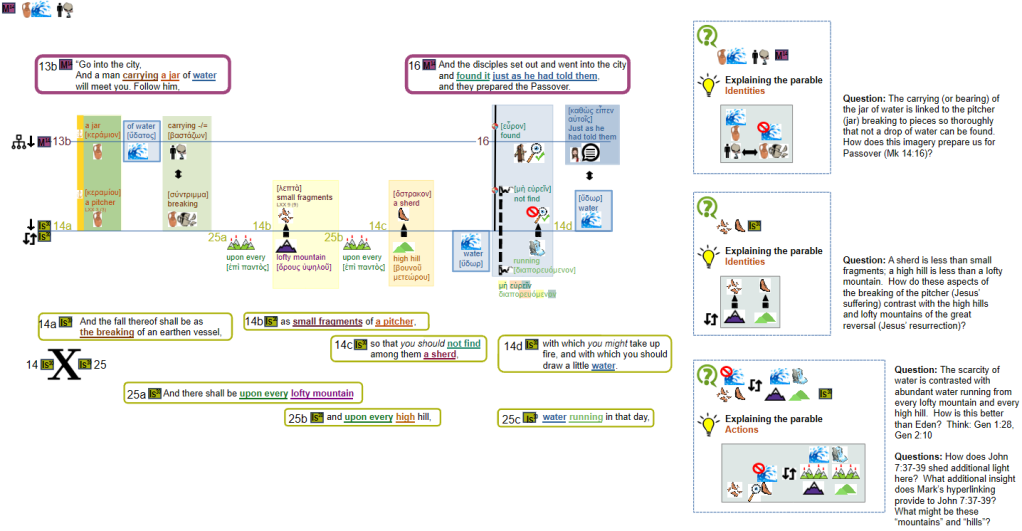 Our first look into the box top starts with jar (keramion) linked as a gold anchor to Isaiah 30’s pitcher (keramiou).  From this association Mark crafted more associations as shown on the right with Mk 14:16 in the following diagram.  You will see many more associations in subsequent blogs.