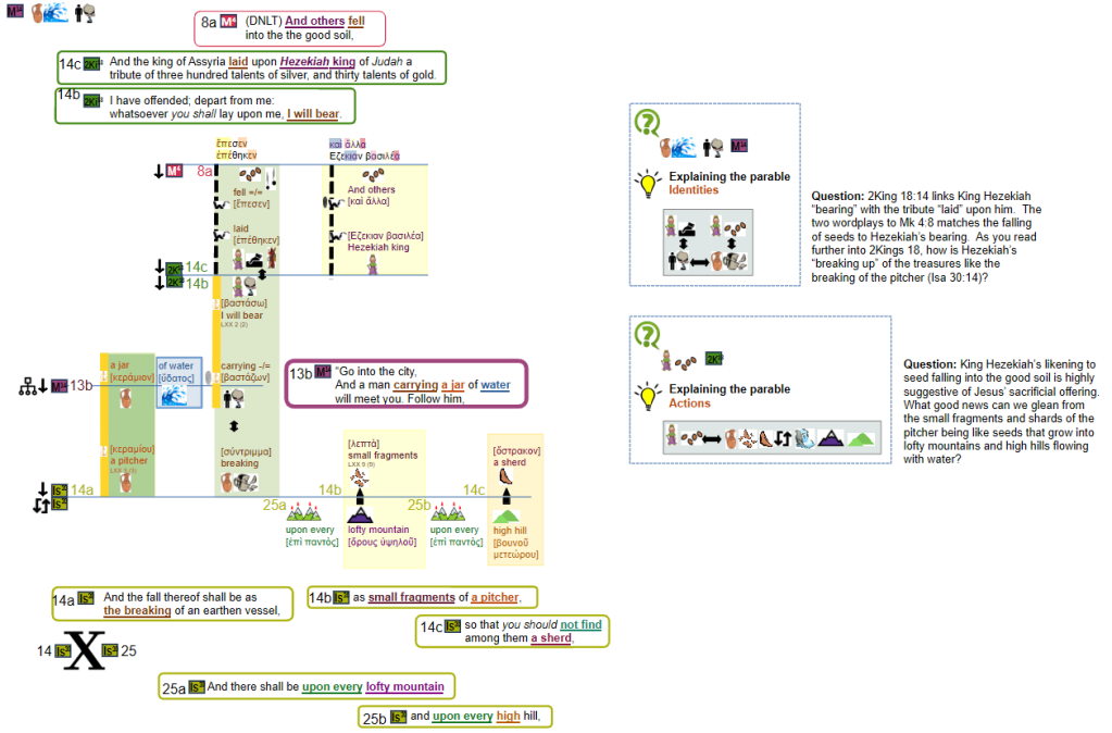 In the diagram above the light yellow boxes group the seed (“And others”) of Mk 4 and the small fragments of Isaiah 14. When Mark establishes a word play like he does with “And others” and “Hezekiah king,” it is not to be cute or a link merely for the sake of linking. The word play itself means something. What does it mean here? Well, by joining seeds and King Hezekiah, it is pointing to the king’s bearing of the gold and silver tribute like seeds falling into the good soil. Unless a seed falls into the ground and dies, it remains alone (Jn 12:24).